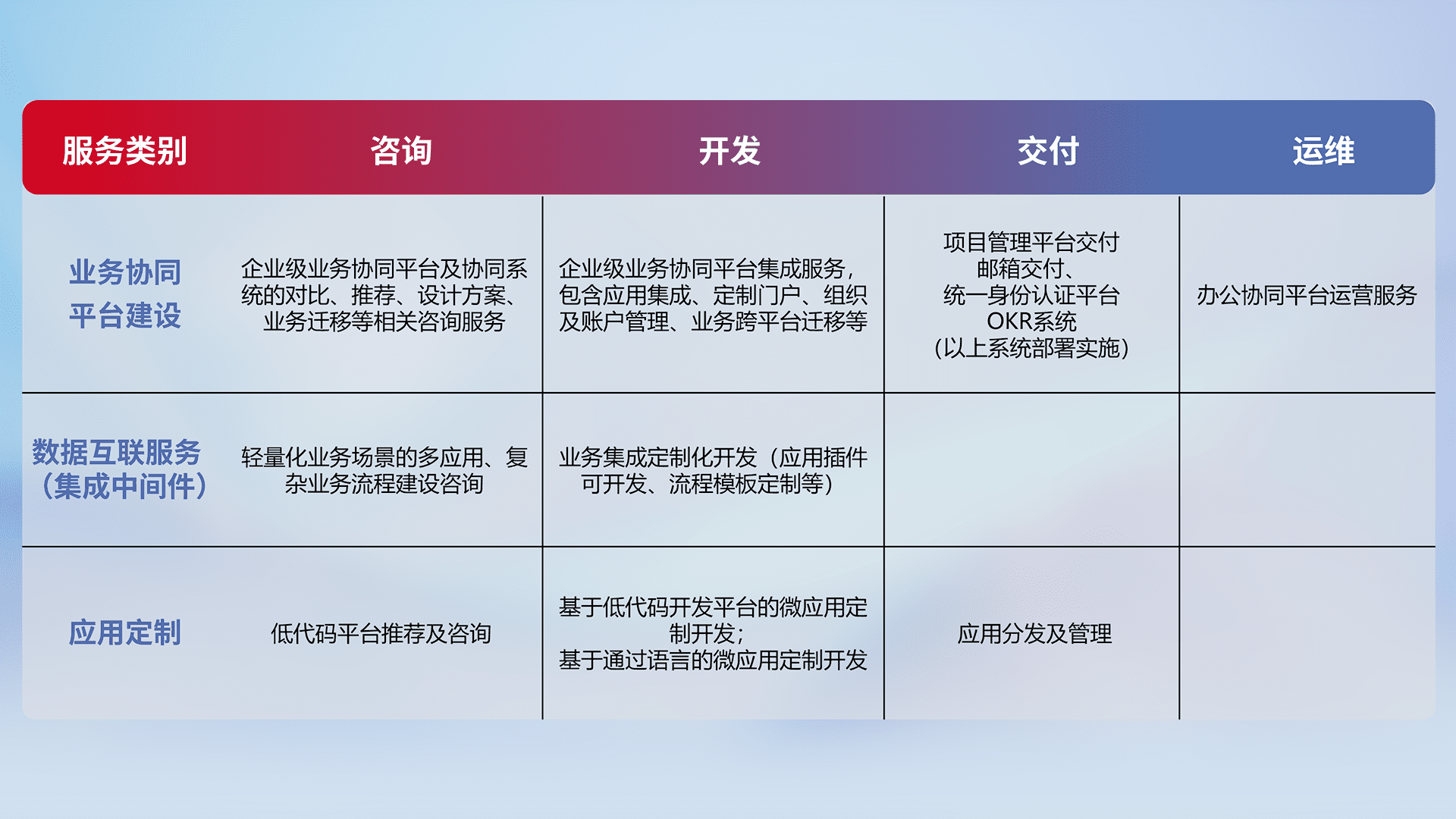 针对钉钉、、企微、、IDaas等平台级产品提供产品的规划、、方案、、、交付、、定制化开发等服务,,,,实现如统一协同办公、、、、智能客户服务、、、混合会议管理、、、智能数据查询、、、、等业务场景,,实现数字化转型。。。。